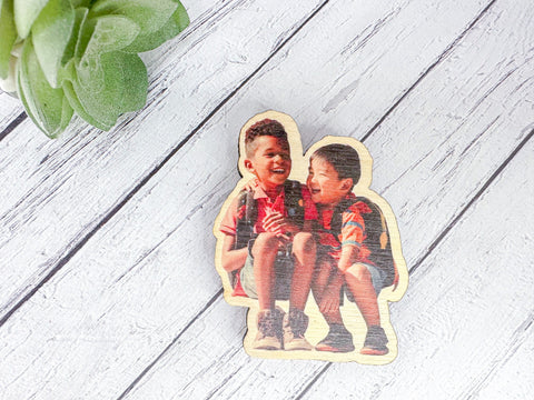 Printed Wooden magnet using your own photo. These make a truly special and unique gift for someone. We have included a few product examples in our photos, but each product will be unique depending on the photo chosen. Any white in the photos will allow the natural beauty of the wood to show through, whereas darker photos will appear grainy.