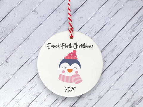 Ceramic Circle Decoration - Baby's first Xmas penguin personalised