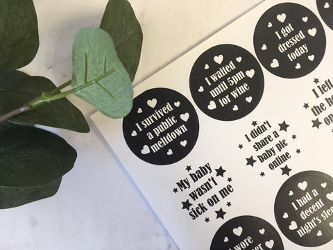 Set of 24 Journey stickers for Mummies to celebrate those small day to day milestones that aren't always easy to achieve with little ones. These would make a unique and lighthearted baby shower gift or gift for a new mum.