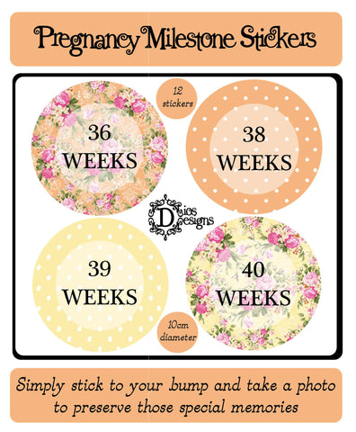 A Set of 12 pre-cut Pregnancy Milestone Stickers which are 10cm in diameter. Simply stick them to your bump to celebrate those key weekly milestones and keep or share the photos to show your bump growing.