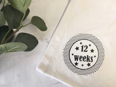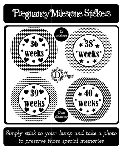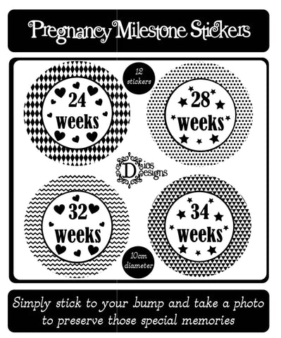 A Set of 12 pre-cut Pregnancy journey stickers which are 10cm in diameter. Simply stick them to your bump to celebrate those key weekly milestones and keep or share the photos to show your bump growing.