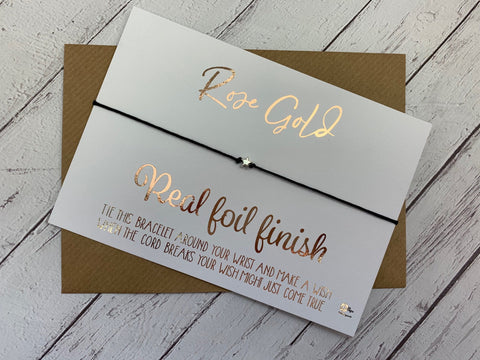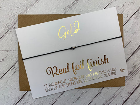 Tibetan silver charm on black waxed cotton cord wish bracelet tied around a piece of A6 (105mm x 148mm) white or kraft 350gsm card, with a choice of black ink, gold foil or rose gold foil print. You can also opt to have it printed onto 4mm thick birch plywood for a truly special gift.