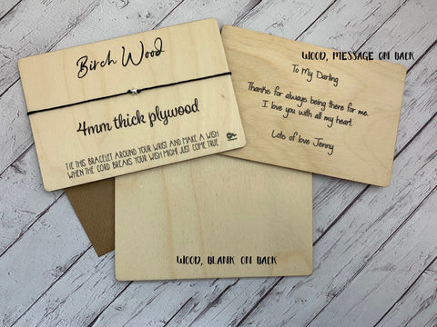 You can choose to have either standard wording as shown in the first photo or your own wording printed onto 4mm thick birch plywood in black ink only (we cannot add foil to wood). The pieces of birch plywood measure 100mm x 150mm and have rounded corners.