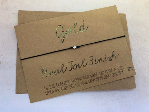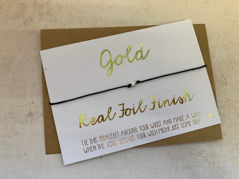 Tibetan silver charm on black waxed cotton cord wish bracelet tied around a piece of A6 (105mm x 148mm) white or kraft 350gsm card, with a choice of black ink, gold foil or rose gold foil print. You can also opt to have it printed onto 4mm thick birch plywood for a truly special gift.
