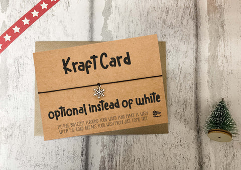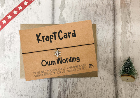Tibetan silver charm on black waxed cotton cord wish bracelet tied around a piece of A6 (105mm x 148mm) white or kraft 350gsm card, with a choice of black ink, gold foil or rose gold foil print. You can also opt to have it printed onto 4mm thick birch plywood for a truly special gift.