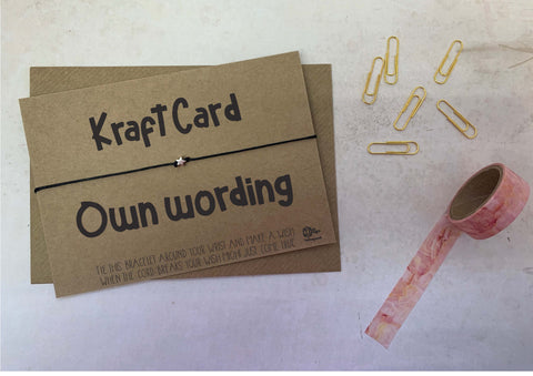 Tibetan silver charm on black waxed cotton cord wish bracelet tied around a piece of A6 (105mm x 148mm) white or kraft 350gsm card, with a choice of black ink, gold foil or rose gold foil print. You can also opt to have it printed onto 4mm thick birch plywood for a truly special gift.